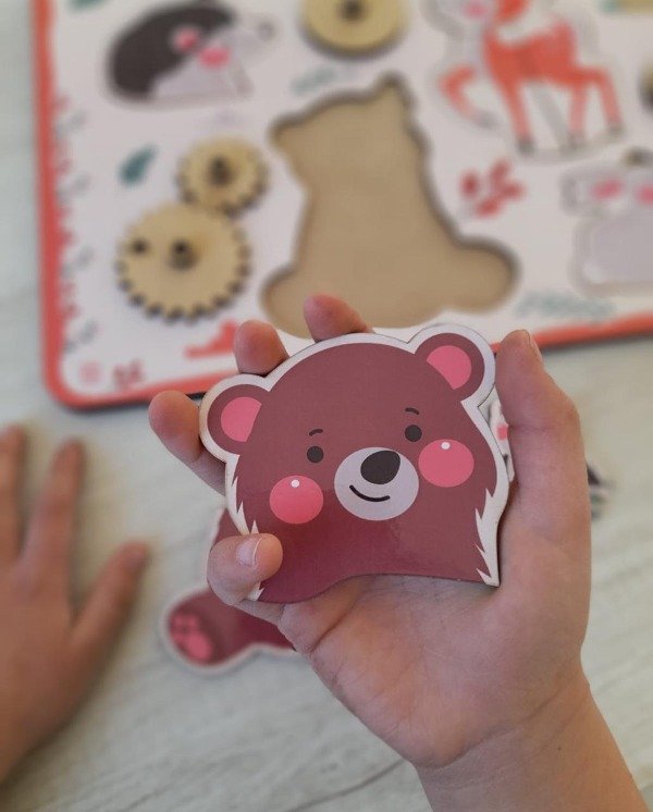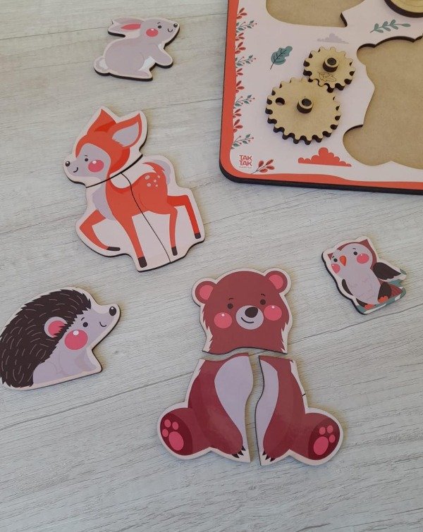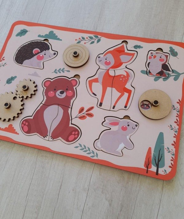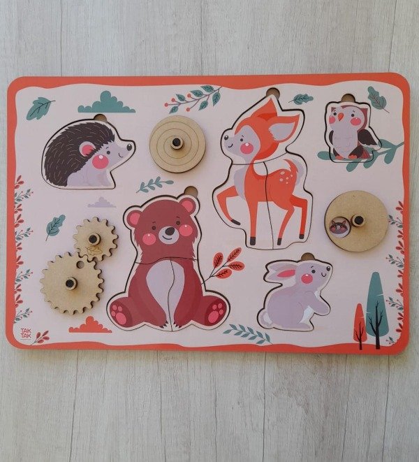 Hermoso panel didáctico en madera. Incluye rompecabezas, engranajes, gira y descubre y disco gira-gira.
